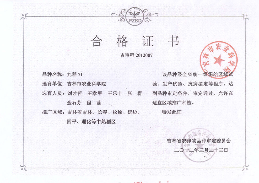 九稻71合格证